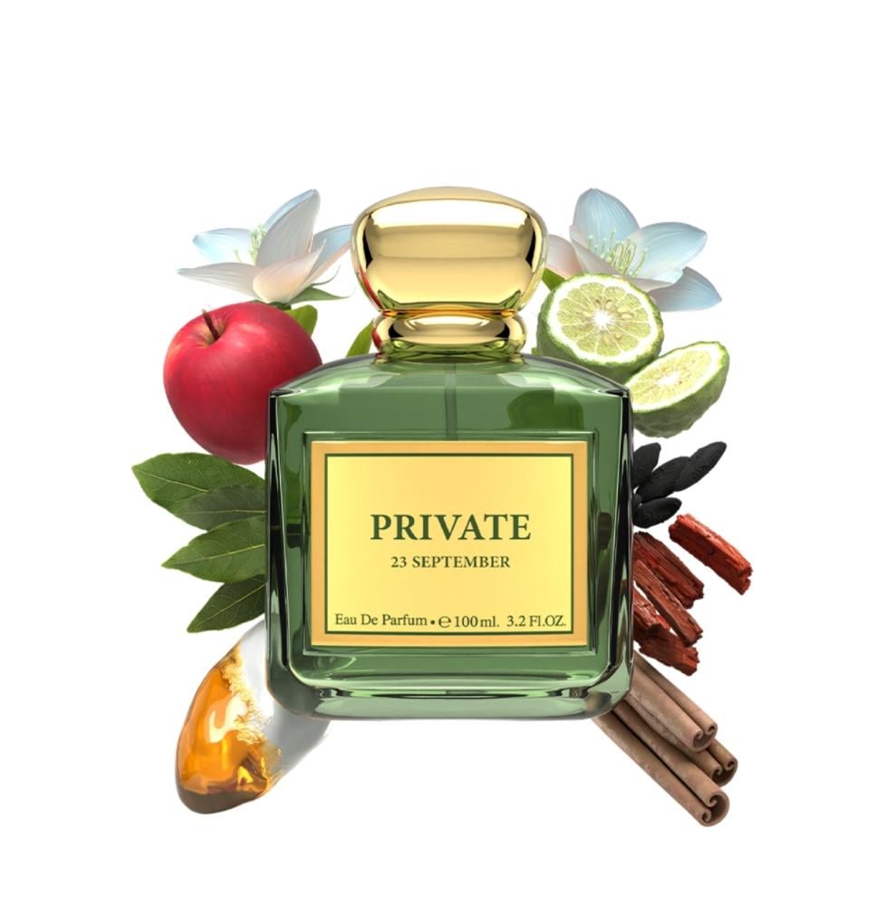 - مكونات عطر برايفت 23 سبتمبر: خلاصة التفاح وبرغموت كالاباريا ، بعدها تصلك رائحة القرفة وخشب الصندل من ميسور و أوراق الليتشي الترابية ، حتى تكمل التوليفة الجمالية بسحر من العنبر الأبيض والمسك الأبيض و التونكا .